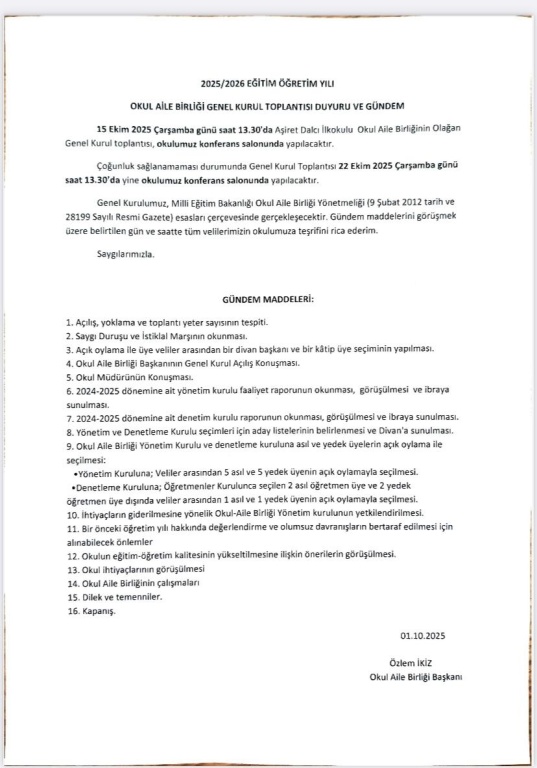 15 EKİM 2025 ÇARŞAMBA günü saat 13.30' da Aşiret Dalcı İlkokulu Okul Aile Birliği'nin Olağan Genel Kurul Toplantıası aşağıdaki gündem maddelerine göre okulumuz konferans salonunda yapılacaktır.