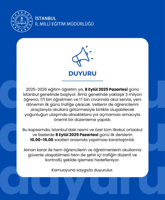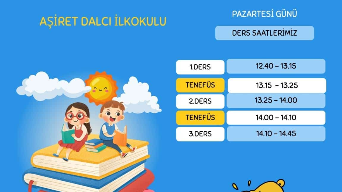İstanbul İl Millieğitim Müdürlüğünce alınan karara göre sadece 8 Eylül Pazartesi günü okul saatlerimiz ; Ders Başlangıç saatimiz 12.40 ,Ders Bitiş saatimiz 14.45'tir.